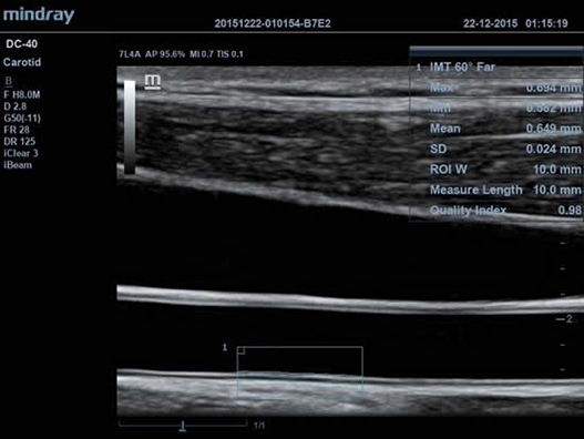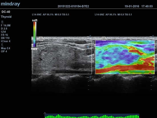 • Natural Touch Elastography - опция оценки эластичности ткани (эластография). Действует на линейных датчиках 7L4A, L12-3E и L14-6NE (в модификации Mindray DC-40 EXP поставляется по умолчанию);