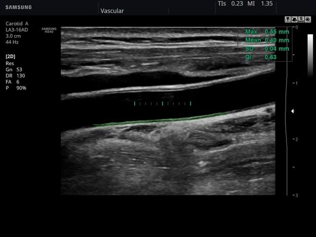 • Модуль Auto IMT - автоматическое вычисление комплекса интима-медиа общей сонной артерии (Intima Media Thickness). Данная оценка имеет большое значение для ранней диагностики атеросклероза и оценки риска развития инсульта и инфаркта миокарда.