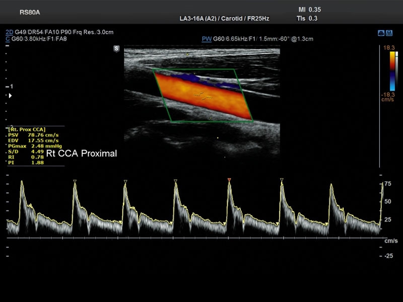• Сонные артерии: автоматическая, полуавтоматическая, ручная трассировка доплеровского спектра; ПСС, КДС, %СтПлощ, %Ст Диам, площадь сосуда, диаметр сосуда, средняя толщина интимы, объемный кровоток.